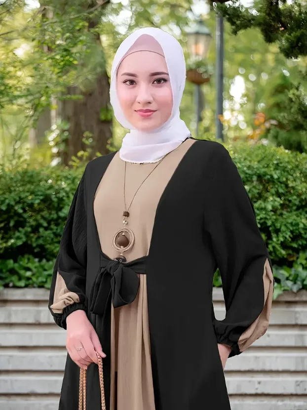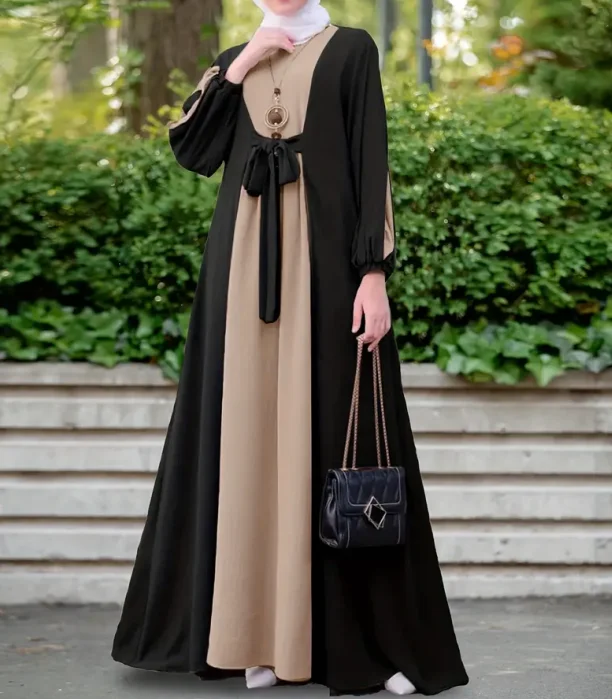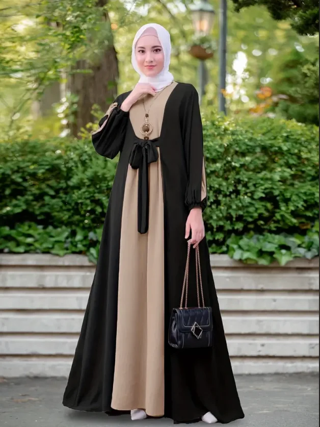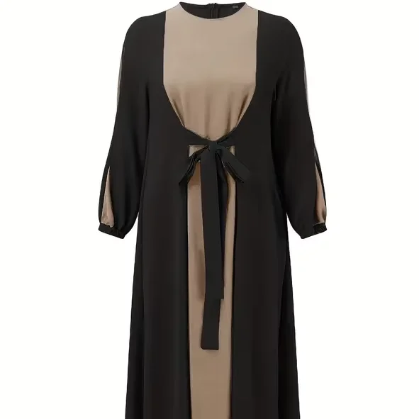 Women's Elegant Long Sleeved Abaya Robe Middle Eastern Muslim Ethnic Clothing Lace-up Waist Anti-Static Breathable Abaya Dress